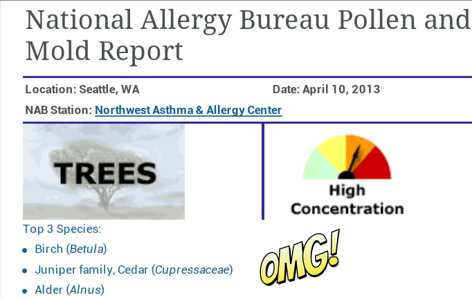 What do I do with this information? I took a child dose of Zyrtec because I thought I should do something, but, as usual, I can’t really pinpoint symptoms. Yeah, my nose runs and my eyes feel … annoying… But, they don’t itch and I’m not sneezing and spluttering like those poor souls in the ads on tv. Should I be taking more antihistamines more often? Could it eventually help some of these allergic reactions I don’t even know I’m having? The doctor last year gave me Nasonex and oral steroids. They went in the drawer, unopened, of course. Maybe my allergic reaction would be more obvious if I went outside and rubbed my back up and down our birch, Baloo-style.