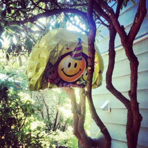 True story: This was the balloon my sister got for my husband for his birthday in April. We kept it as it lost its buoyancy because it cheered me up. The other day, I was in the bathroom upstairs and this big yellow smile floated across the window. It was very surreal. An air current had somehow sent it out the open back door. I found it stalled on this branch, but couldn’t reach it. Then it floated through the garden as my dog chased it and… up, up and away. I was very happy to watch it soar away, but it was a bit melancholy, too.