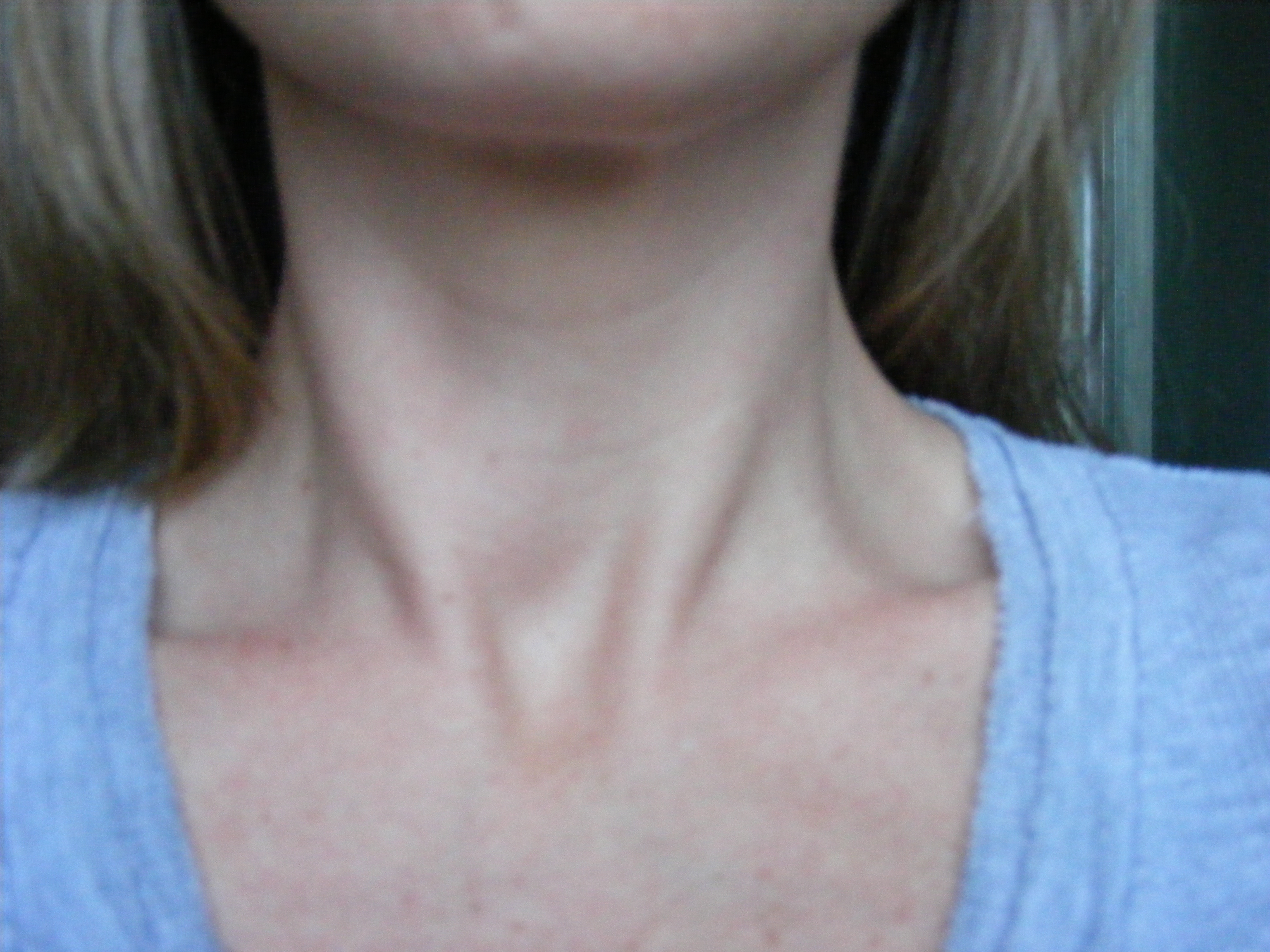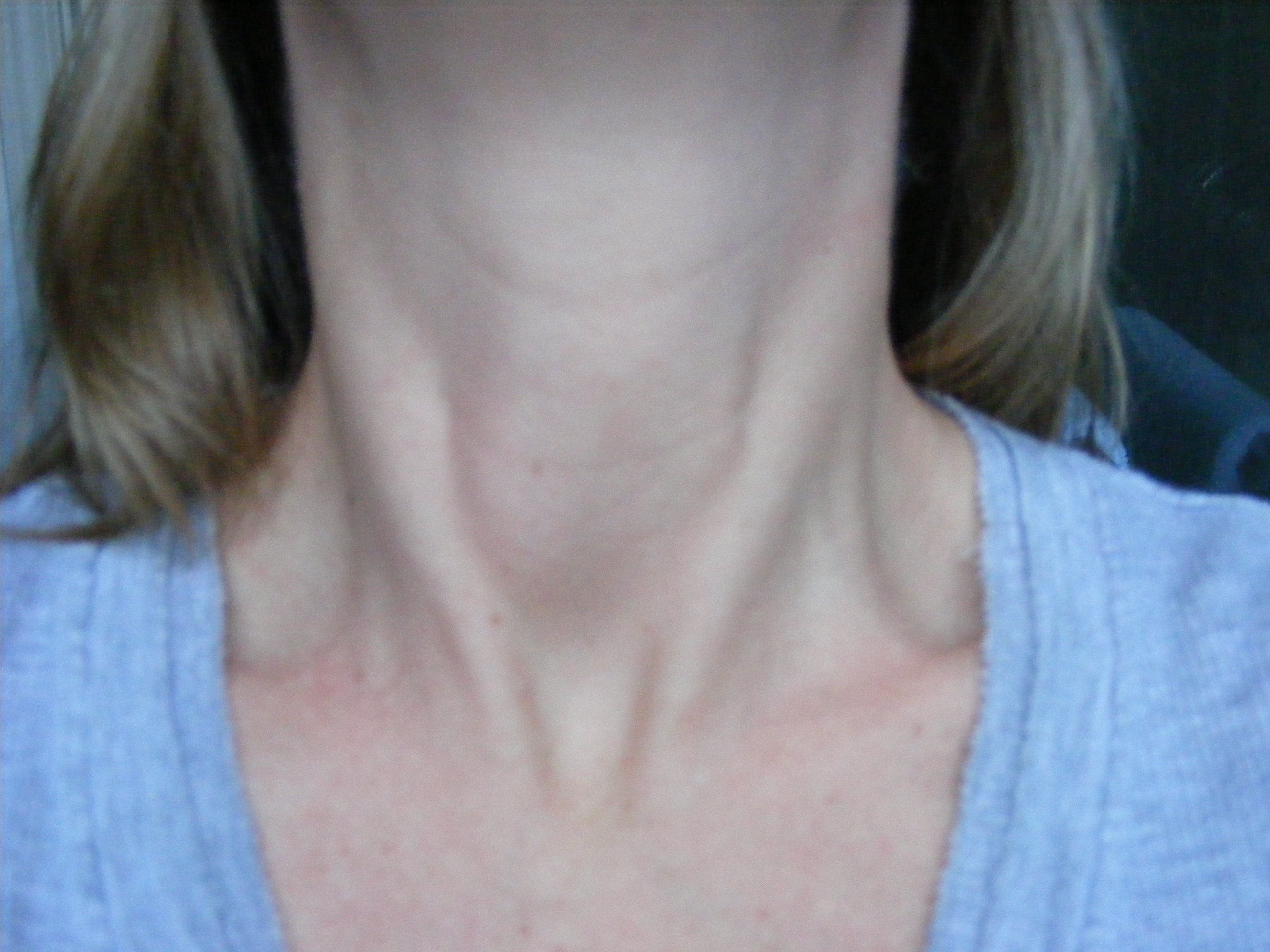 I have attached 3 pictures that I took before I got radiation treatment (ablation). The first is looking at my neck as I stand relaxed, the next is with my head back and the third was taken as I swallowed. I can’t believe I never noticed the lump on my thyroid. I can’t believe nobody else did. I can’t believe, with 7+ years of abnormal TSH (thyroid stimulating hormone) levels, neither a doctor nor I, myself, looked any closer at my neck or my symptoms.  [The radioiodine must have swelled my thyroid, however there was definitely a visible lump before treatment that I never noticed until it was pointed out -and it is unforgivable that no doctor ever took the time to look further into my bloodwork or palpate my throat.]