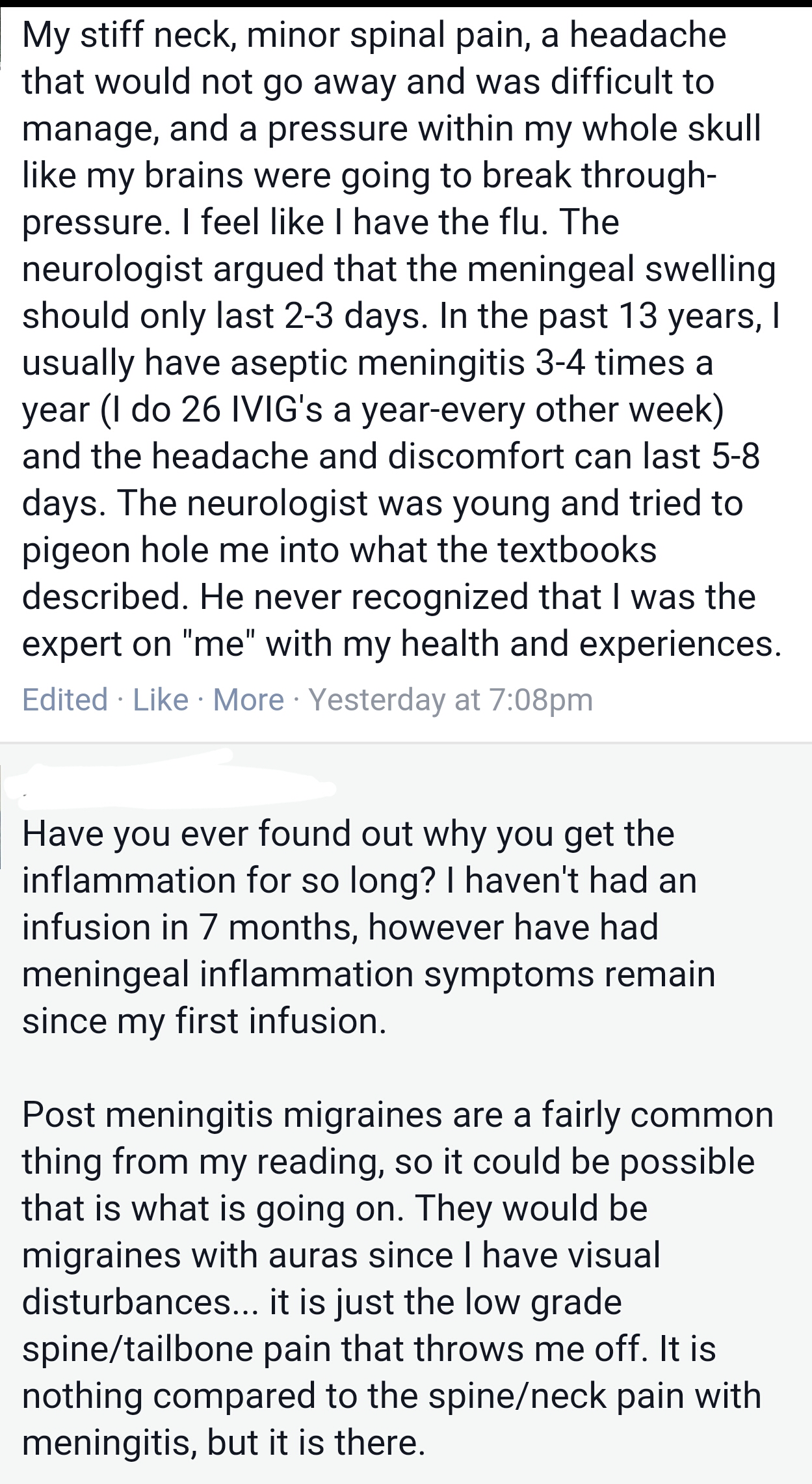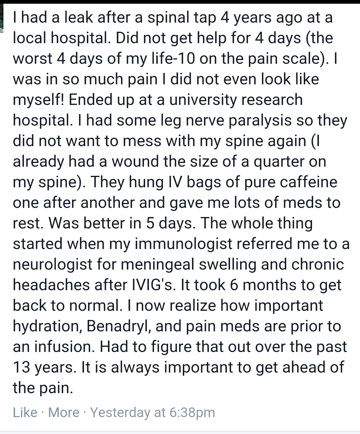 Having said that, I pay attention to comments like this since I, too, once had a CSF leak from a lumbar puncture and it was the 10 on my pain scale to which I now compare everything else. IVIG can mess you up: