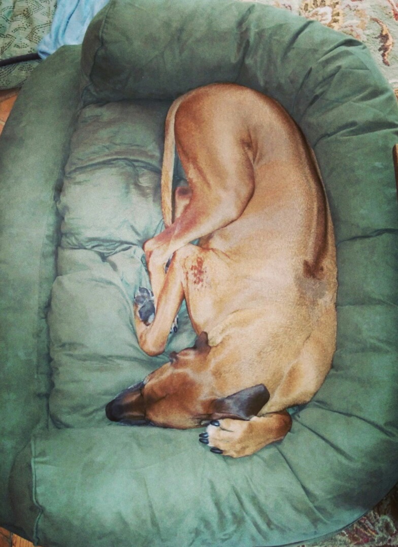 We bought a proper comfy dog bed for the kids seeing as they are arthritic and bony (it was on sale, has no fire retardants and is returnable at any time, even if used). It’s the size of a small country. 110-pound Bowie is thrilled when he can actually lie in it and Little Guy doesn’t relegate him to the crappy small bed.