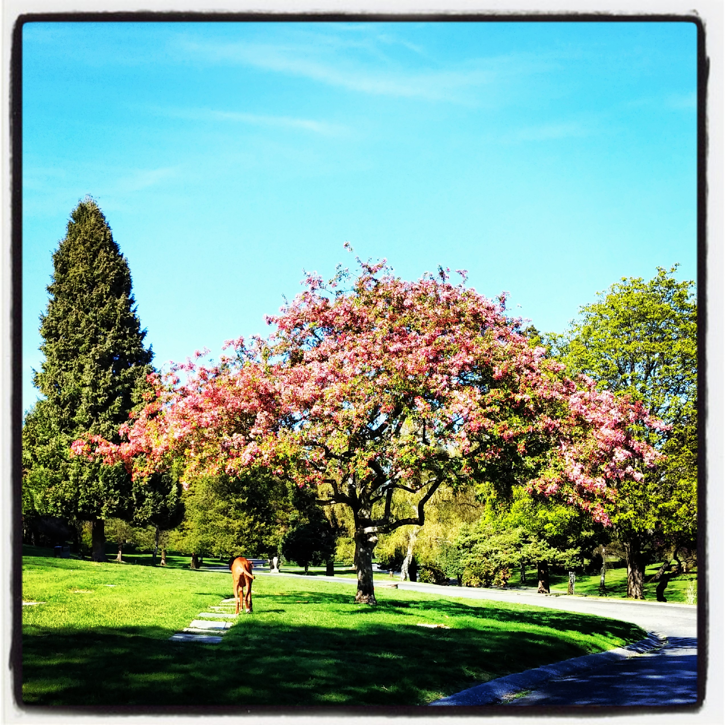 And I made it to the cemetery on my mobility scooter for a 40-minute “walk”, with beautiful spring coming to life everywhere I looked.